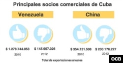 China con $200 millones y Venezuela con $146 millones de dólares, acumulan la mitad de las exportaciones cubanas, que incluyen cífras tan pequeñas como dos mil dólares a Bélgica y diez mil a Italia.