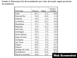 Los blancos representan el 64.1% de la población cubana, los mulatos el 26.6% y los negros el 9.3%, según cifras publicadas por la Oficina Nacional de Estadísticas de Cuba en un estudio titulado "El color de la piel según Censo de Población y Viviendas del 2012".