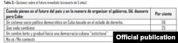 Entre los principales resultados de la consulta pública, el informe resalta una "marcada preferencia de los cubanos por la democracia como forma de gobierno, (...) por un sistema sociopolítico democrático basado en el estado de derecho (56%); por votar como forma de participación cívica y política (58%), y por poder afiliarse a un partido, plataforma o movimiento político (62%)".