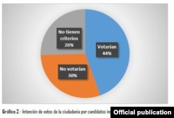 Al indagar si el las elecciones municipales se presentaran candidatos a delegados de circunscripción con latos valores cívicos-morales y, a su vez, con un pensamiento político diferente al del partido comunista de Cuba, y si votarían por ellos, el 44% dijo que sí, el 30% señaló que no votaría, y el 26% dijo no tener criterio sobre el tema.