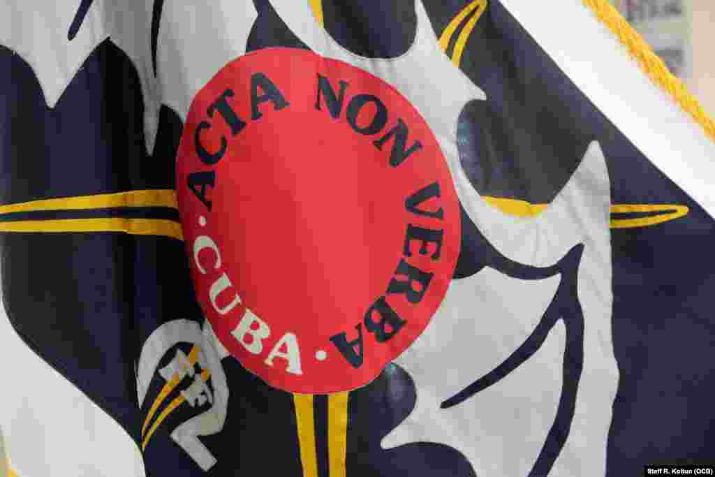 Salón de entrada del Museo de la Brigada de Asalto 2506. Al centro, la bandera cubana con la imagen de la Virgen de la Caridad del Cobre.