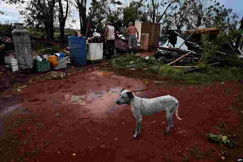A couple talks among the debris of a house after the passage of hurricane Rafael in Alquizar, Artemisa province, Cuba on November 7, 2024.